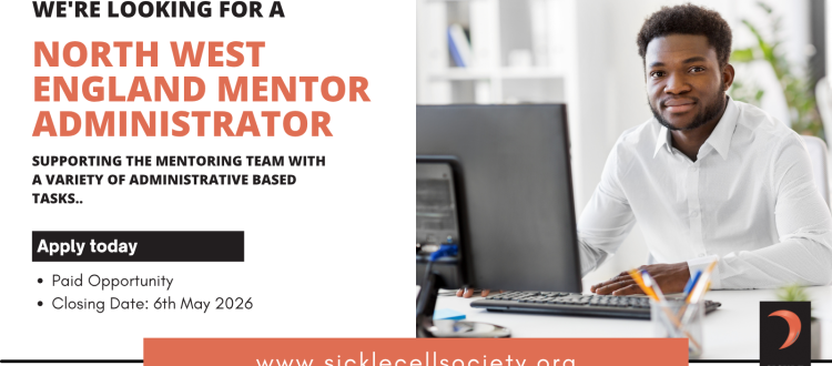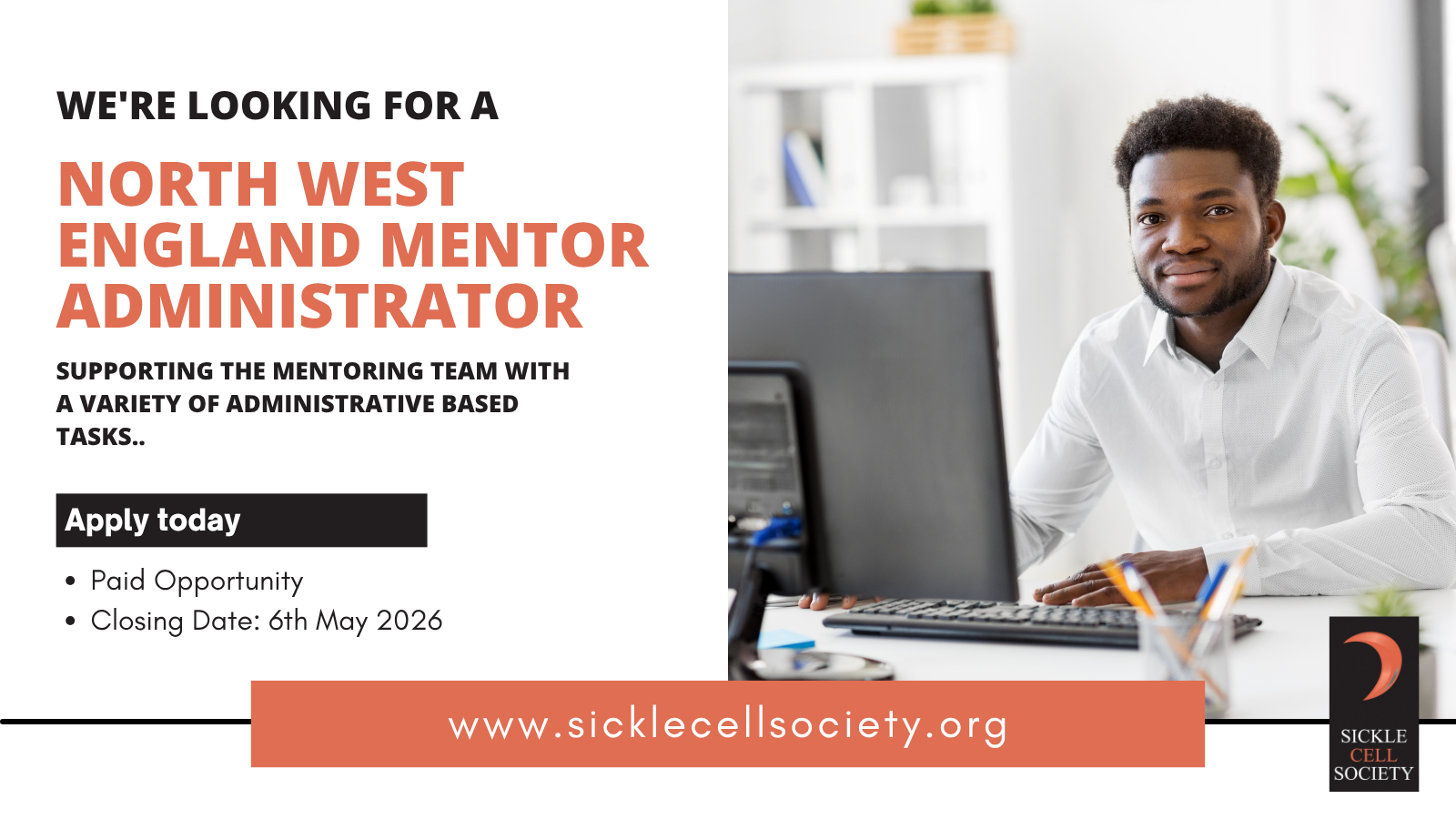 The Sickle Cell Society is seeking a Part-Time Mentor Administrator to join the team and support the delivery of the Children and Young Persons’ Peer Mentoring Programme. The programme aims to enhance the health and wellbeing of young people (aged 10-24) with Sickle Cell Disorder (SCD) across North-West England (Liverpool, Manchester) and South Yorkshire (Sheffield).