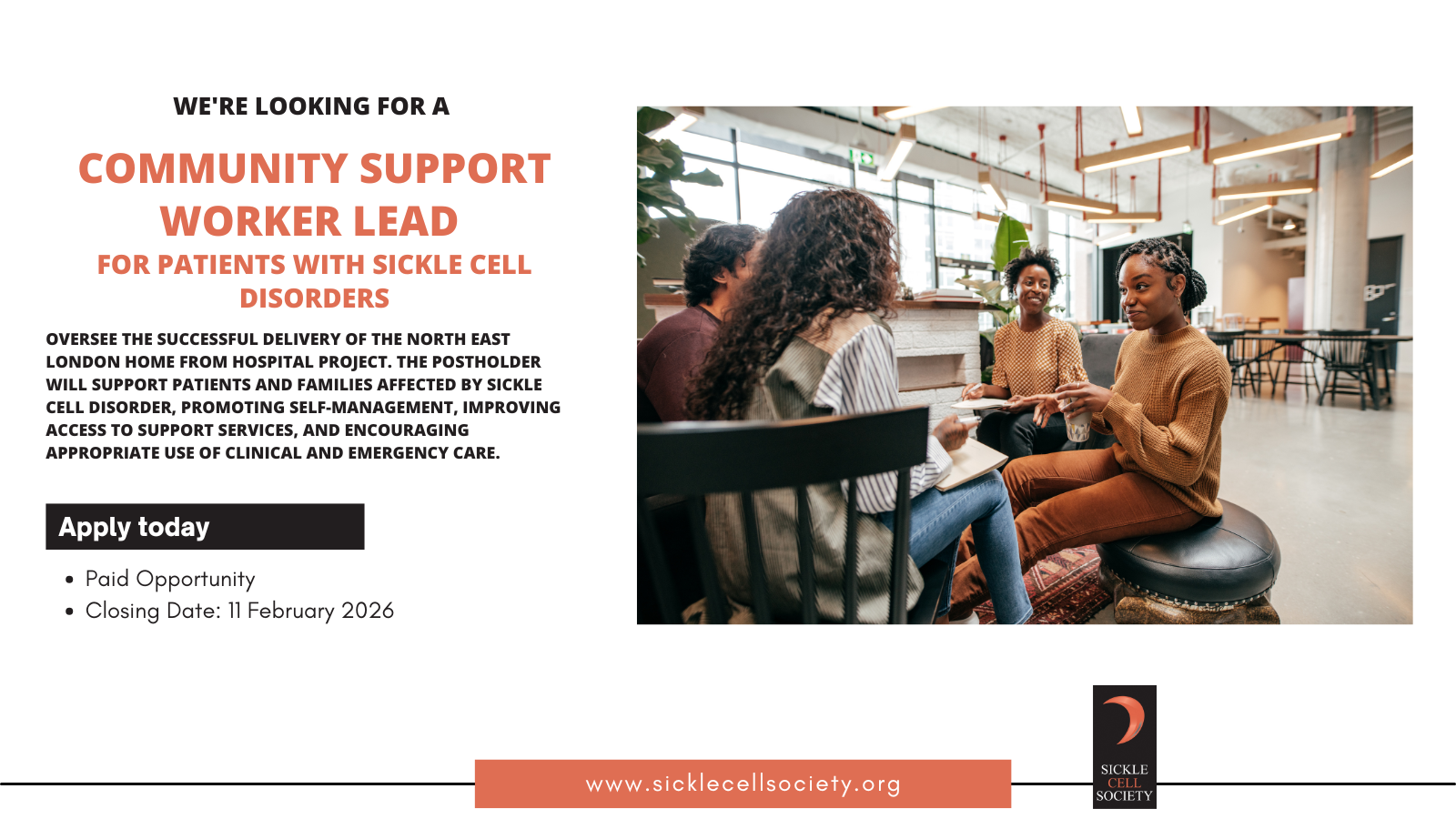 The Sickle Cell Society is looking to recruit a Support Worker to join the team to provide community based support, advice and guidance to patients recently discharged from hospital following acute care for sickle cell disorders or thalassaemia.